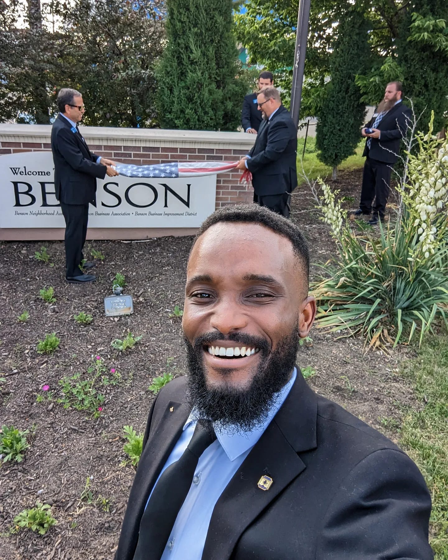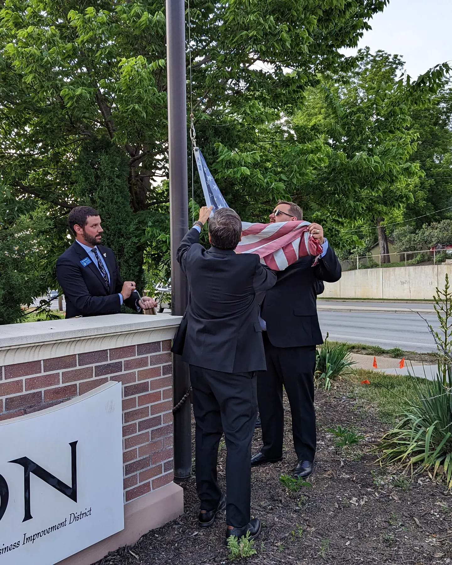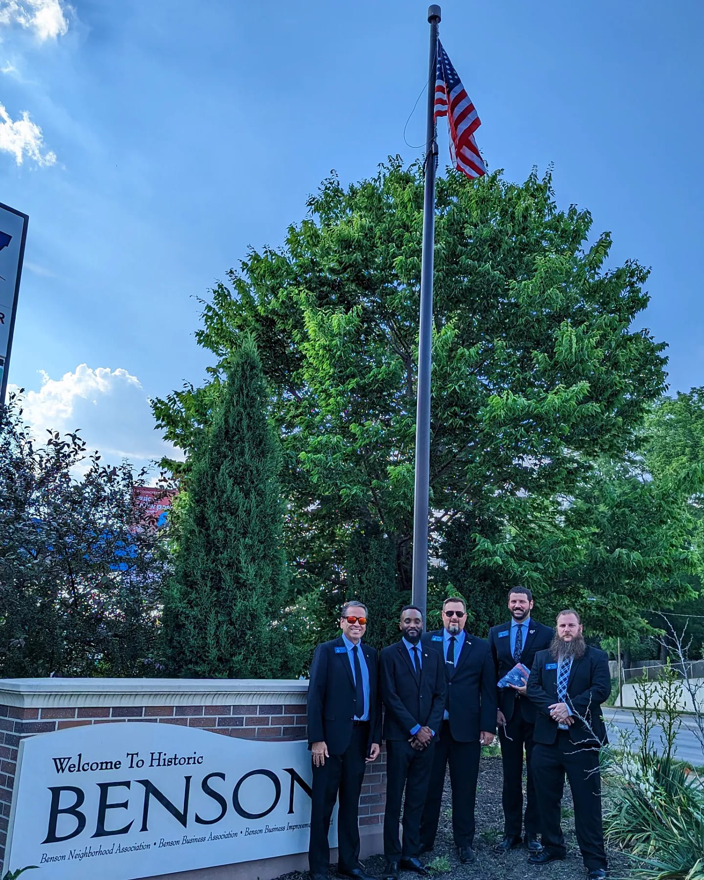 Mercer Men replace the flag at the entrance to the Creative District of Benson